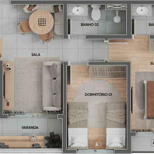 Unidades de 56,9m² a 129,7m² com opções de 2 a 3 dormitórios, 1 suíte e varanda gourmet